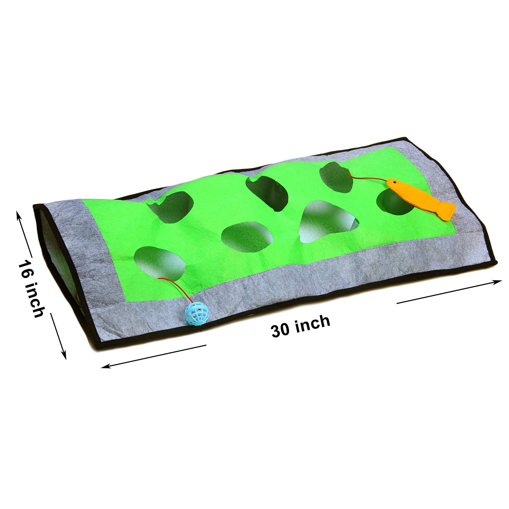 The colorful felt tunnel mat features multiple peek holes and hanging toys that stimulate curiosity, hunting instincts, and mental activity. -
