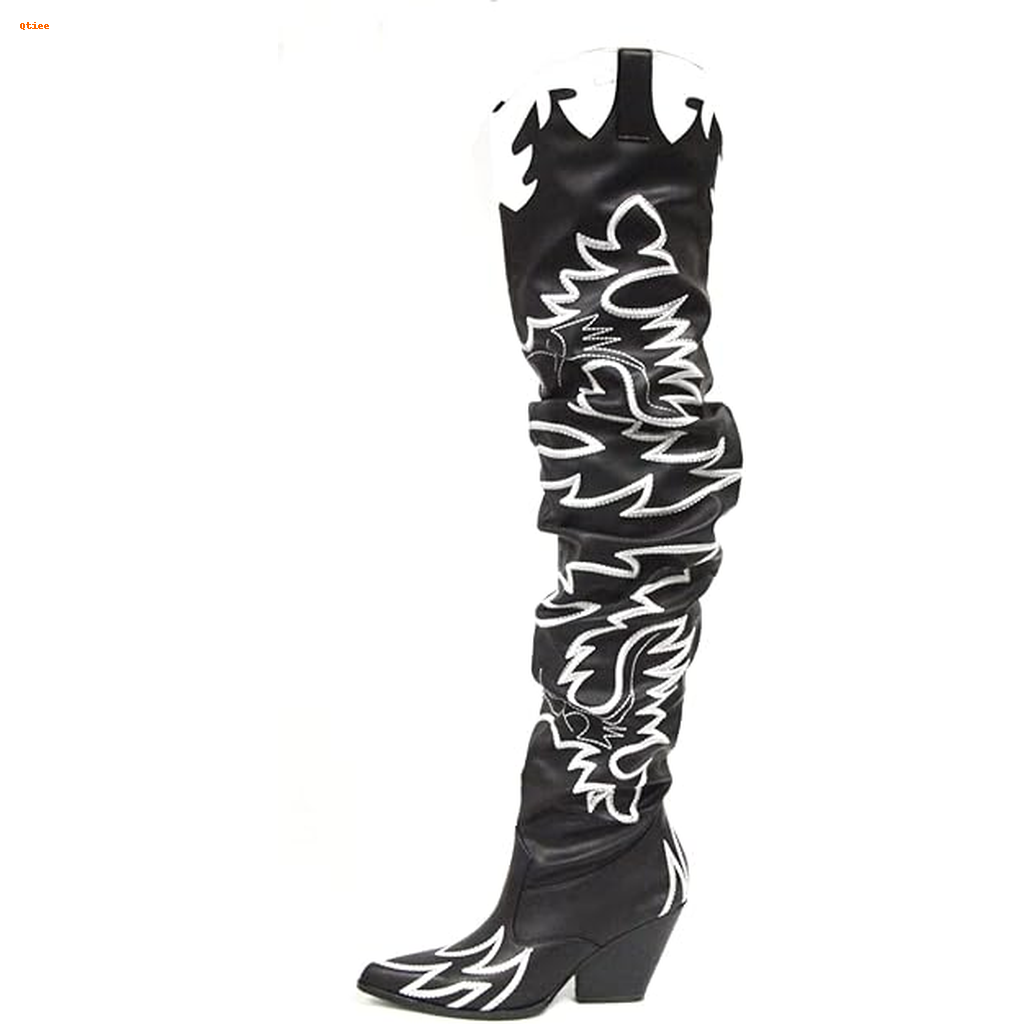 Bold Western Aesthetic: Classic cowgirl silhouette elevated with intricate white embroidery and a dramatic over-the-knee design.
