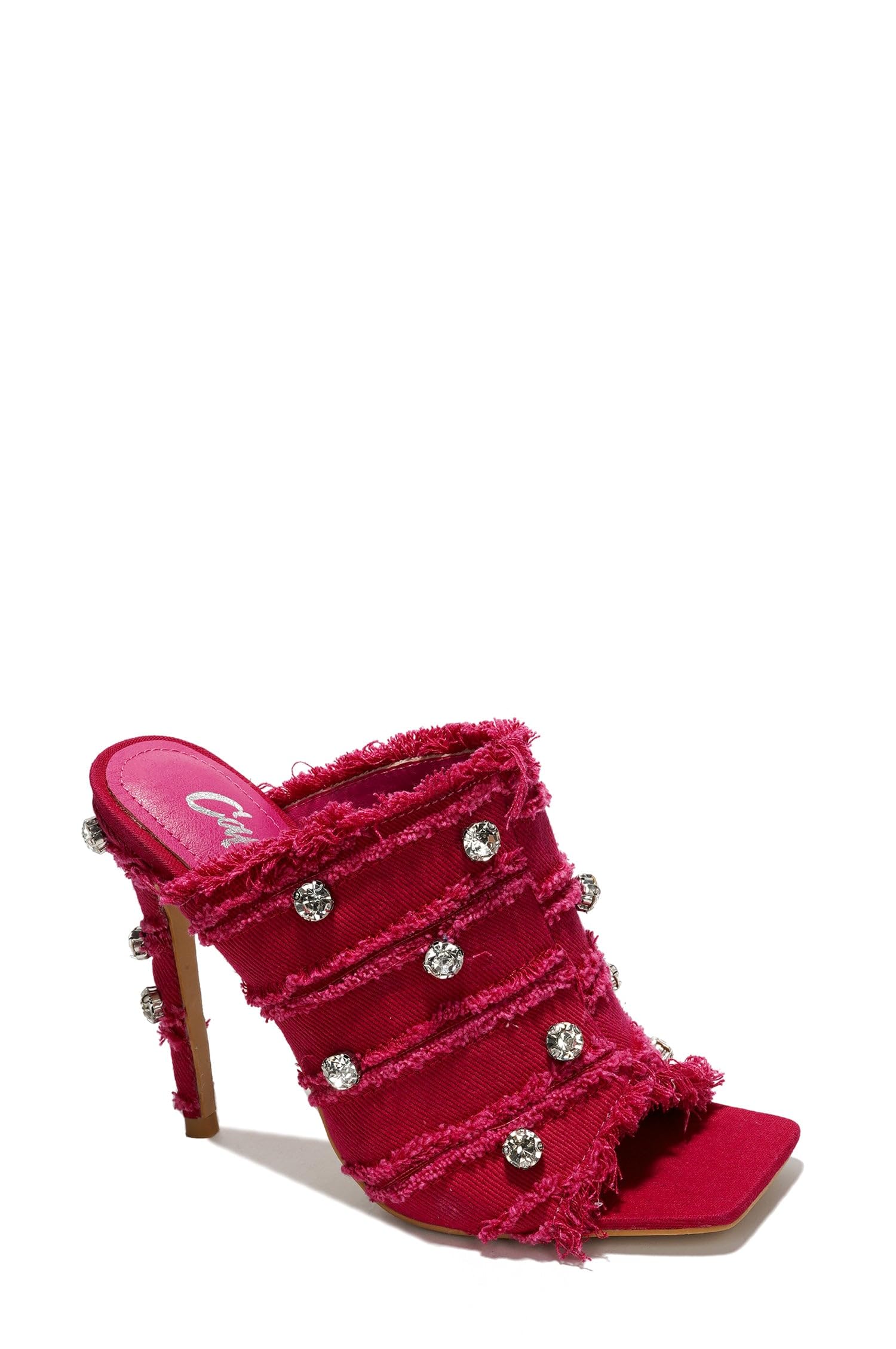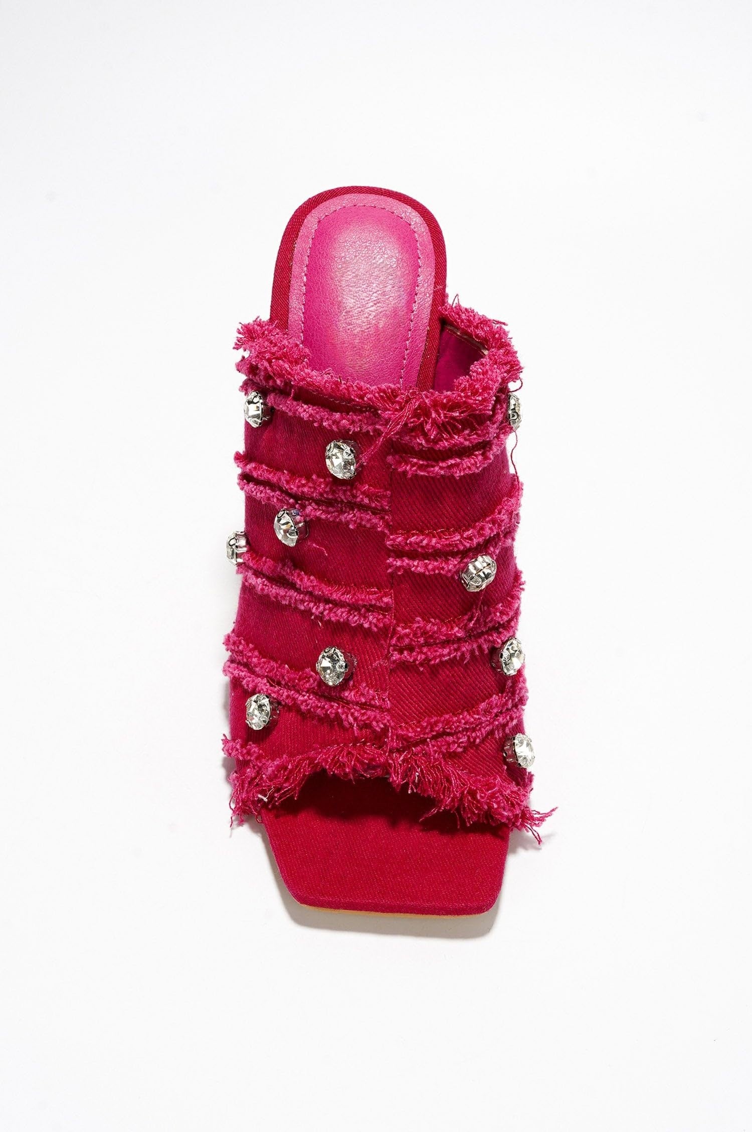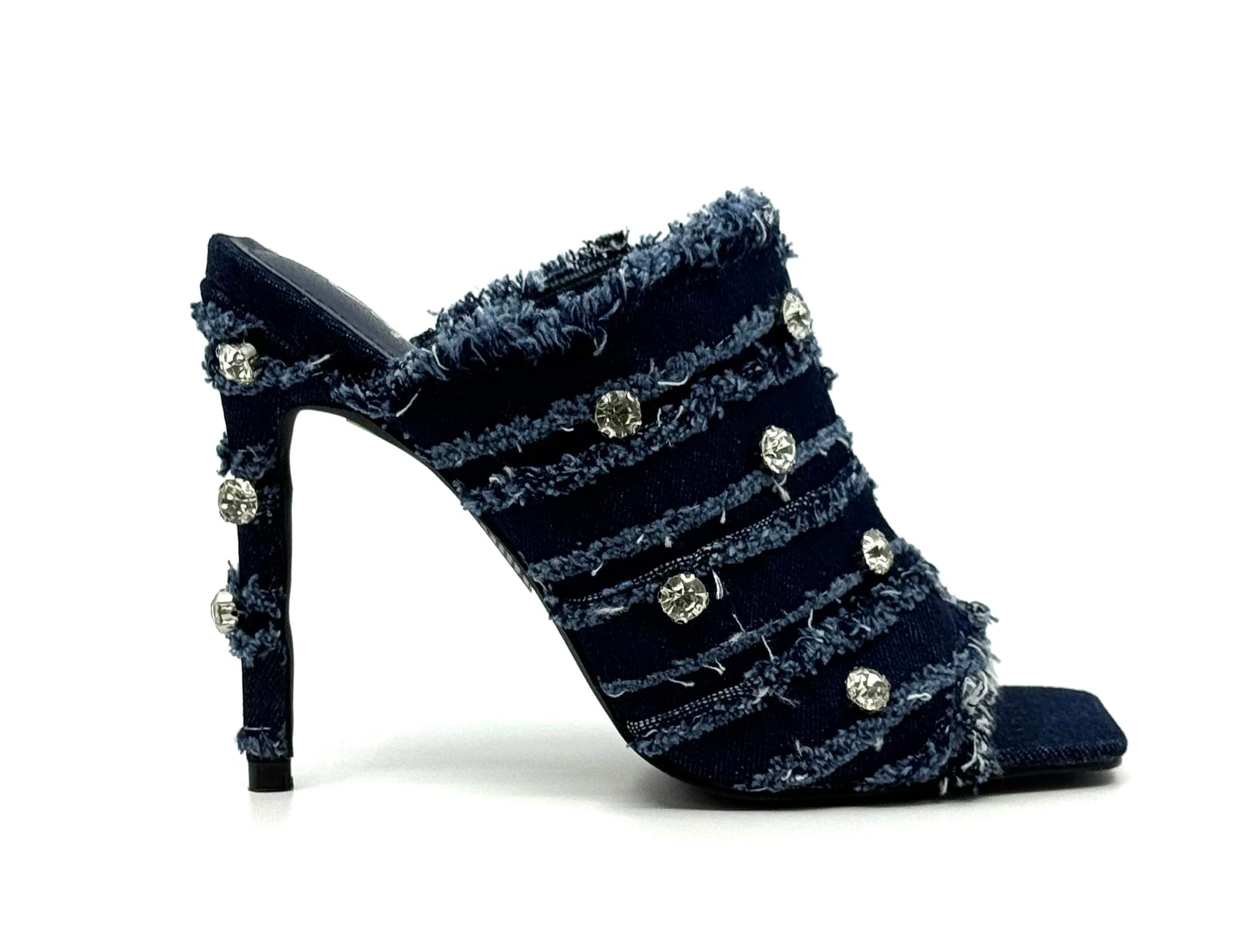 Revolt Women’s Rhinestone Denim High Heel Mules – Frayed Square Toe Stiletto Party Heels